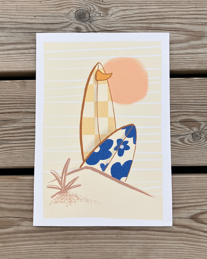 Cap sur l’océan avec cette affiche surf life style ! Deux planches de surf posées dans la dune, le sable chaud, la mer au loin… Tout l’esprit de la côte Atlantique réuni dans une illustration pleine de soleil et de liberté.