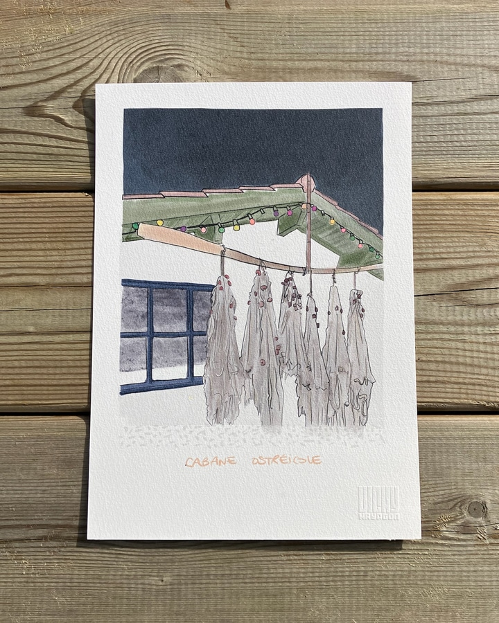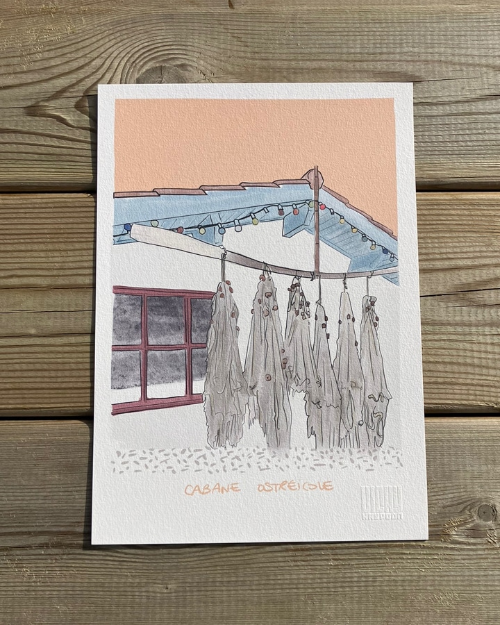 Cette affiche représente une des cabanes ostréicoles typiques que l’on retrouve dans les ports du Bassin d’Arcachon.