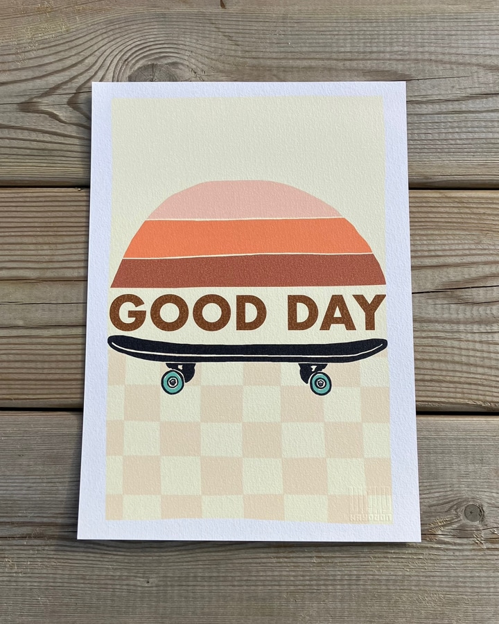 Cette affiche, dans un style graphique, évoque les good vibes du skate pour passer une belle journée.