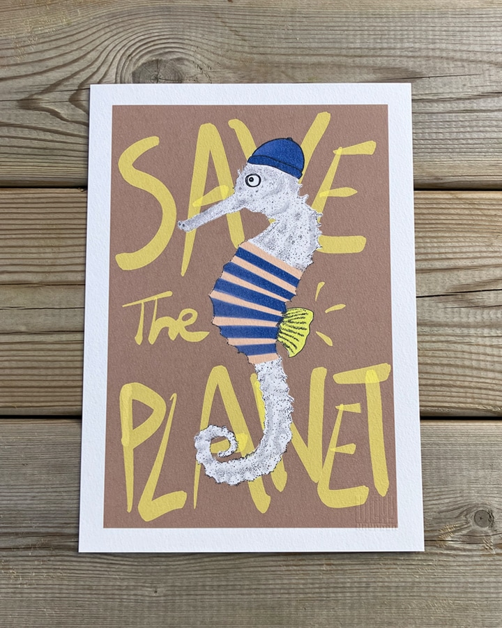Cette affiche met en scène un hippocampe, symbole du bassin d’arcachon et de la fragilité, de la beauté des écosystèmes marins, accompagné du message fort « Save the Planet ». Une affiche pleine de sens qui invite à la réflexion sur la préservation de la biodiversité.