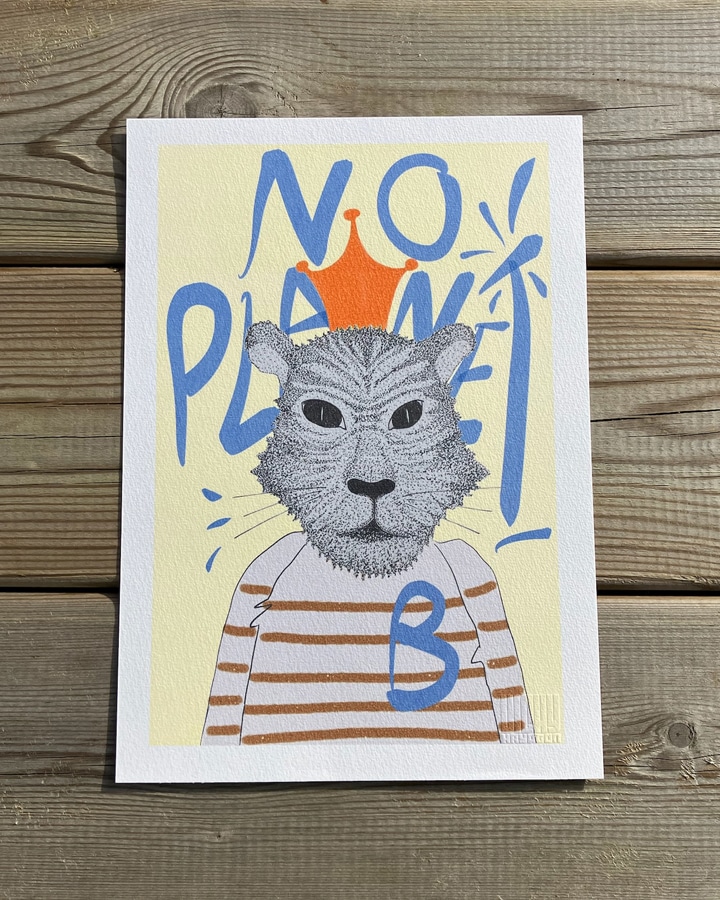 Cette affiche d’un lion, symbole de force et de protection de la nature, pour faire passer son message puissant « No Planet B » baby.
