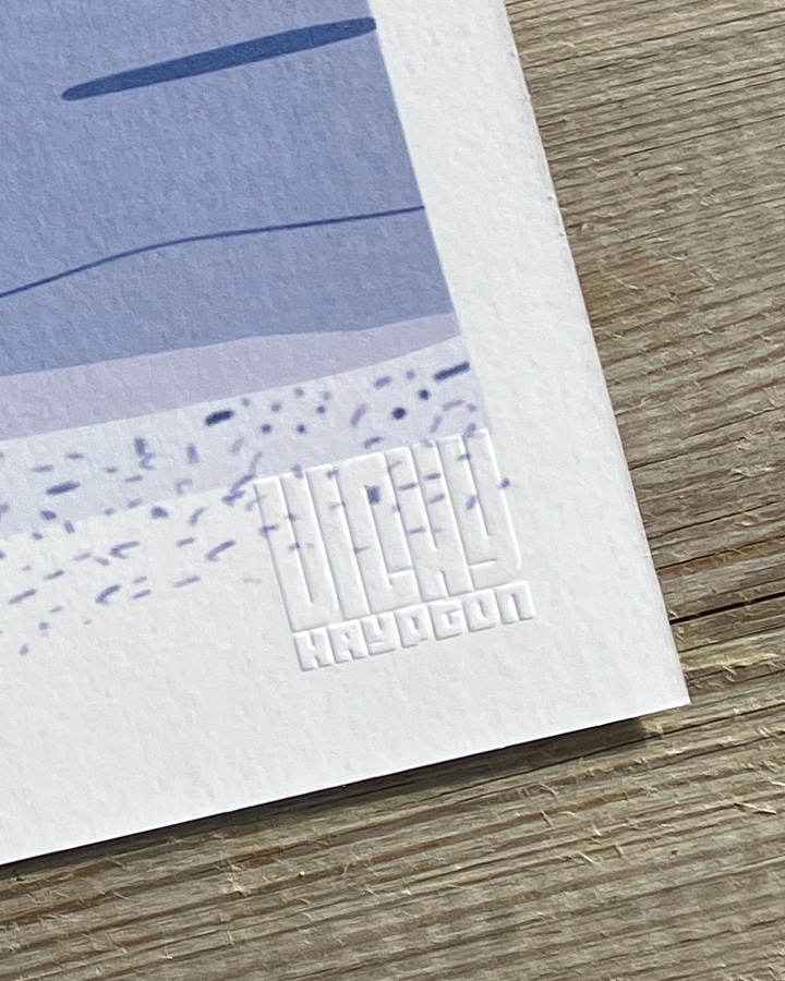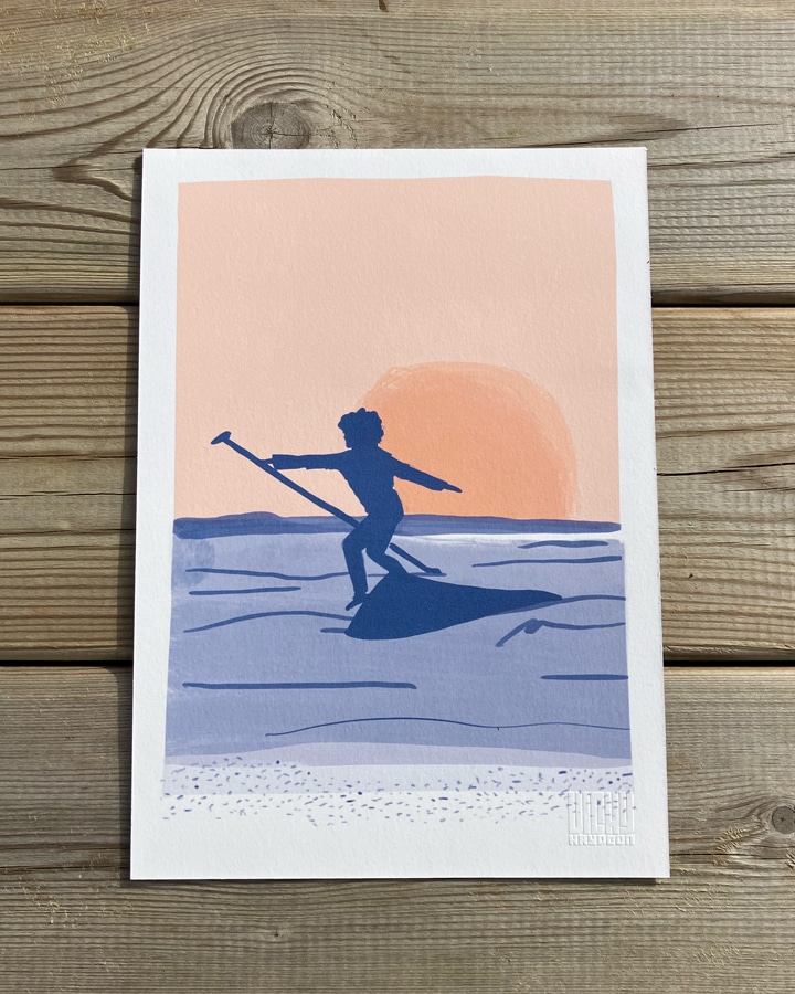 Affiche illustrée d’un enfant sur un paddle. Légèreté, soleil et esprit d’aventure sur le Bassin d’arcachon avec le sunset en arrière plan.