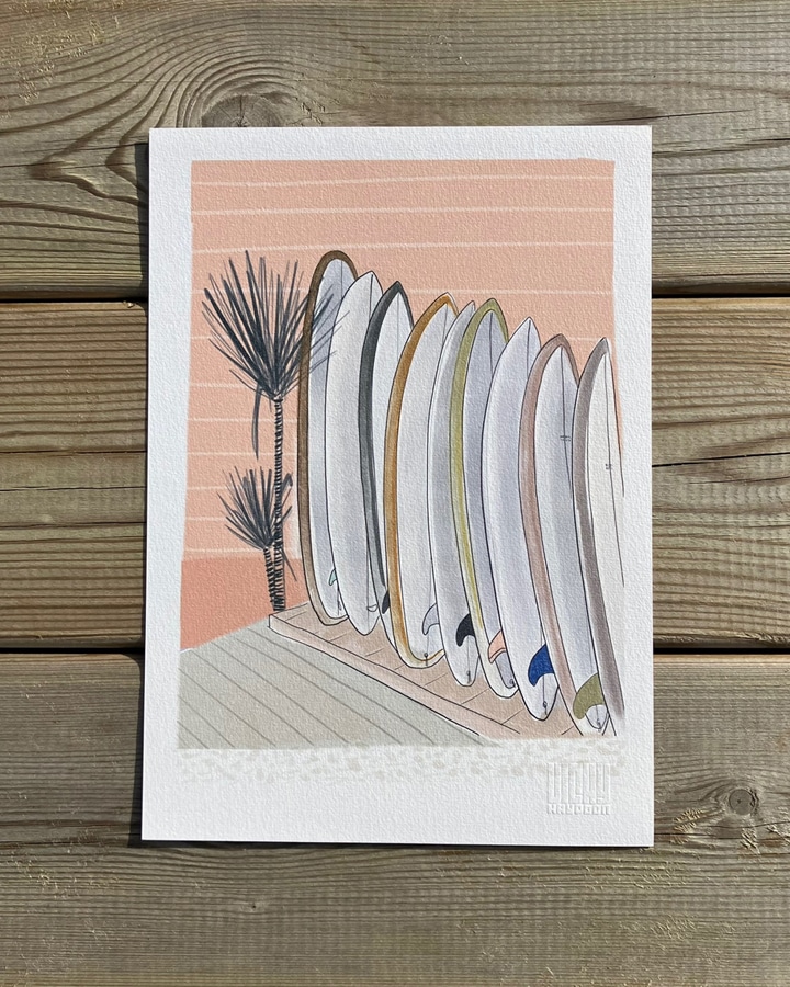 Apportez les good vibes du surf à votre déco avec cette affiche de planches de surf inspirée des plages du Sud Ouest entre l’océan et le Bassin d’Arcachon.