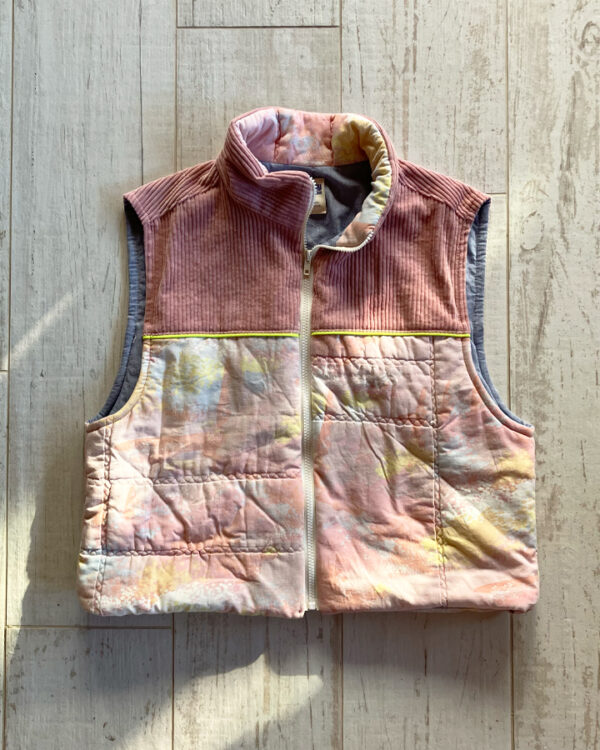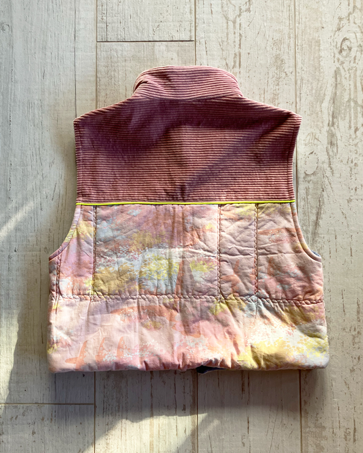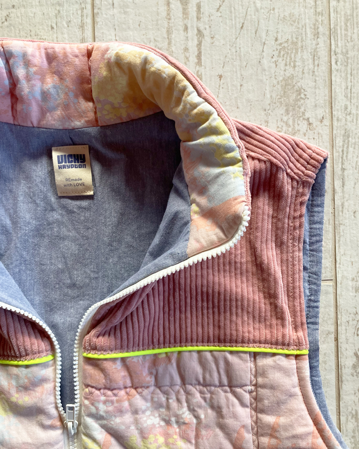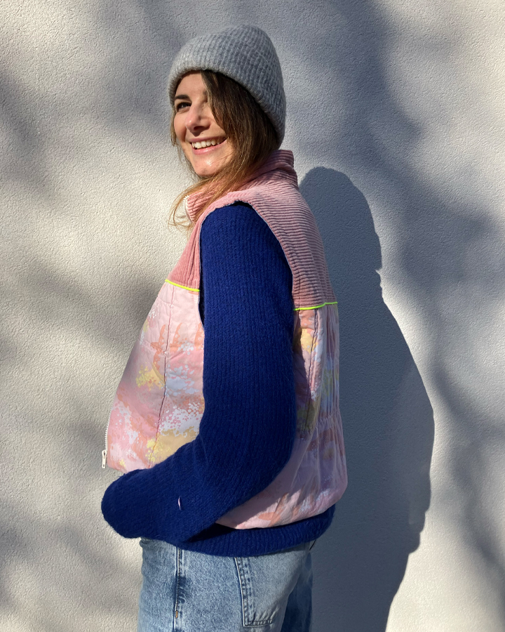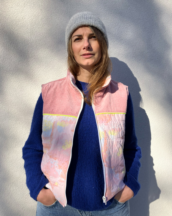 Doudoune sans manches upcyclée à fermeture zippée, col montant et une emmanchure large. Parfaite à superposer sur un gros pull, un sweat, une veste en jean ou même sous un manteau, elle apporte confort et style à toutes vos tenues.
