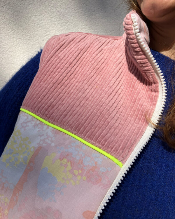Avant j’étais : un duvet vintage et un pantalon en velours cotelé rose