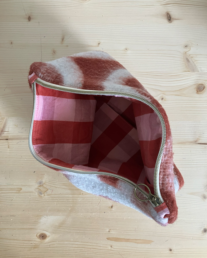 Une pochette upcyclée et unique, sa sangle permet de la porter à la main ou bien la glisser dans son sac !
