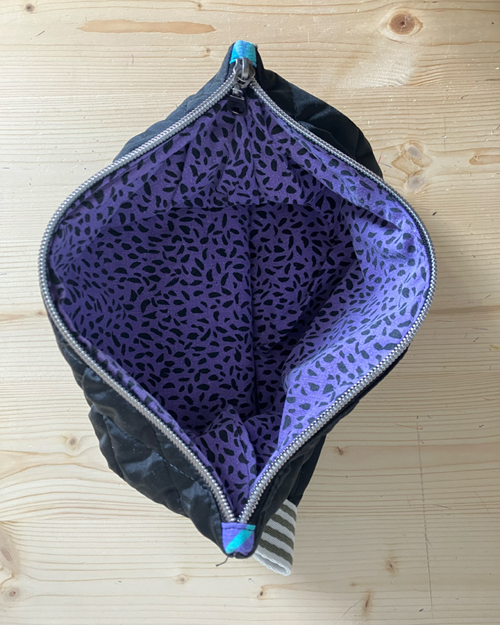 Une pochette upcyclée et unique, sa sangle permet de la porter à la main ou bien la glisser dans son sac !