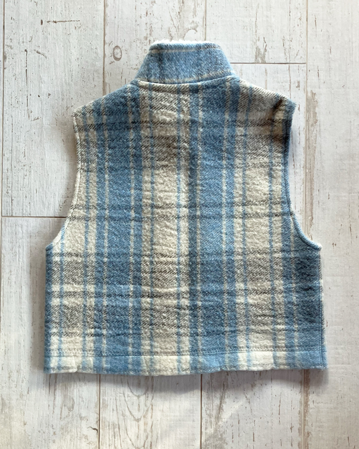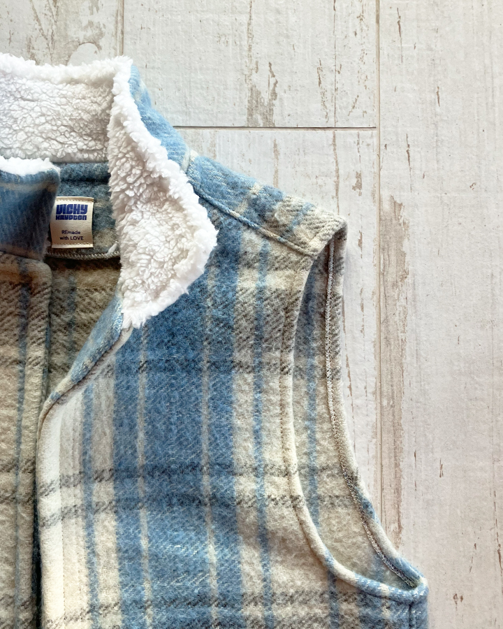 Veste sans manches 100 % upcyclée à col montant et une emmanchure large. Parfaite à superposer sur un gros pull, un sweat, une veste en jean ou même sous un manteau, elle apporte confort et style à toutes vos tenues.