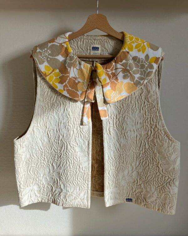 La veste sans manches 100 % upcyclée avec son col claudine est conçue en taille unique, avec une emmanchure large. Parfaite à superposer sur tee-shirt, un gros pull, une chemise à manches bouffantes ou même une veste en jean, elle apporte confort et style à toutes vos tenues.