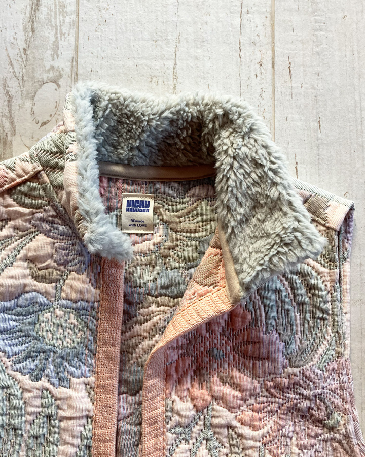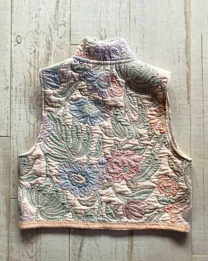 Veste sans manches 100 % upcyclée à col montant et une emmanchure large. Parfaite à superposer sur un gros pull, un sweat, une veste en jean ou même sous un manteau, elle apporte confort et style à toutes vos tenues.