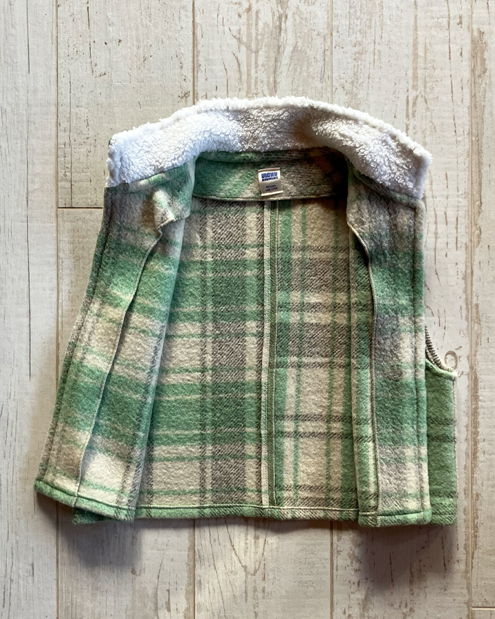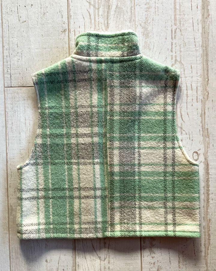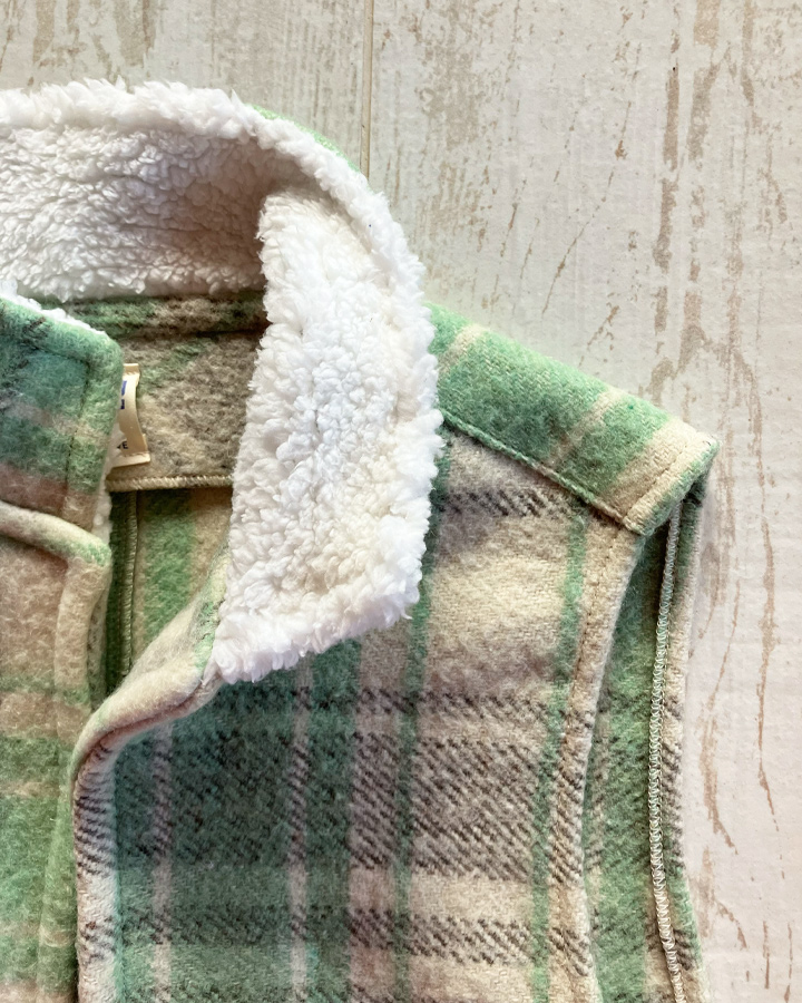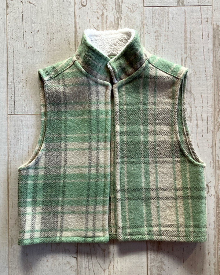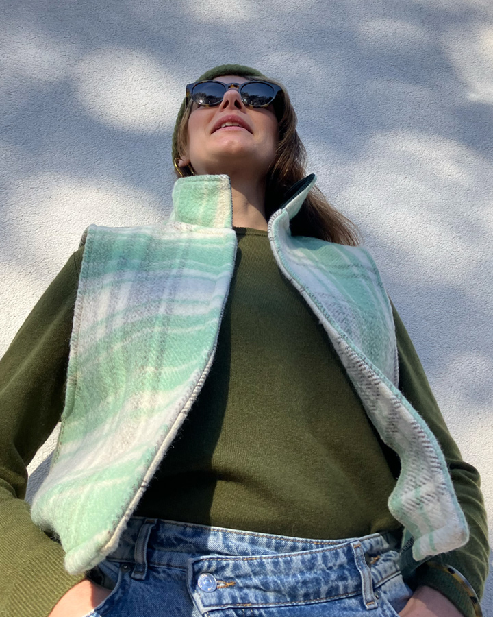 Veste sans manches 100 % upcyclée à col montant et une emmanchure large. Parfaite à superposer sur un gros pull, un sweat, une veste en jean ou même sous un manteau, elle apporte confort et style à toutes vos tenues.