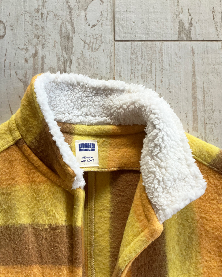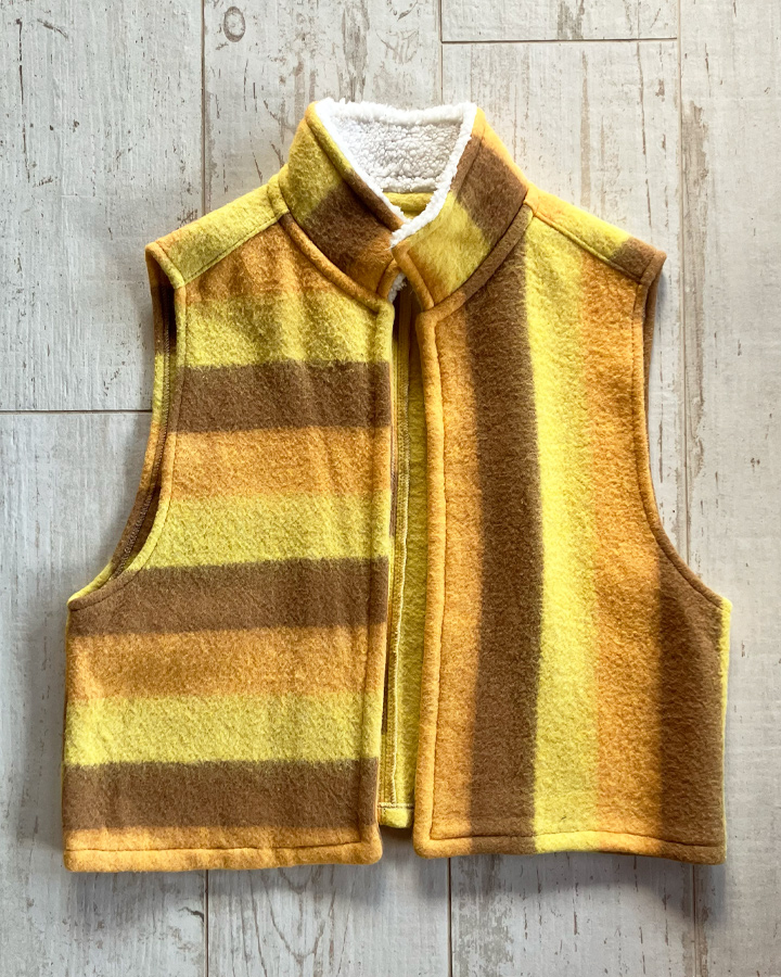 Veste sans manches 100 % upcyclée à col montant et une emmanchure large. Parfaite à superposer sur un gros pull, un sweat, une veste en jean ou même sous un manteau, elle apporte confort et style à toutes vos tenues.