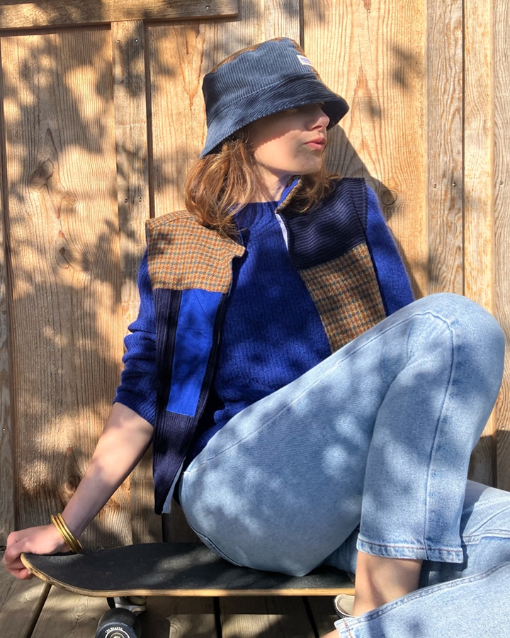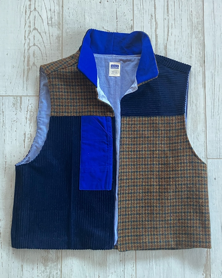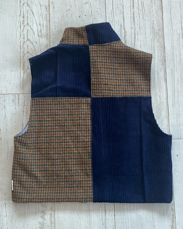 La veste sans manches 100 % upcyclée à col montant est conçue en taille unique, avec une emmanchure large. Parfaite à superposer sur un gros pull, une chemise à manches bouffantes ou même une veste en jean, elle apporte confort et style à toutes vos tenues.