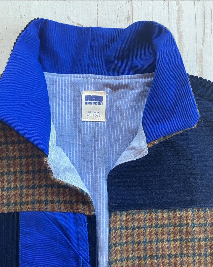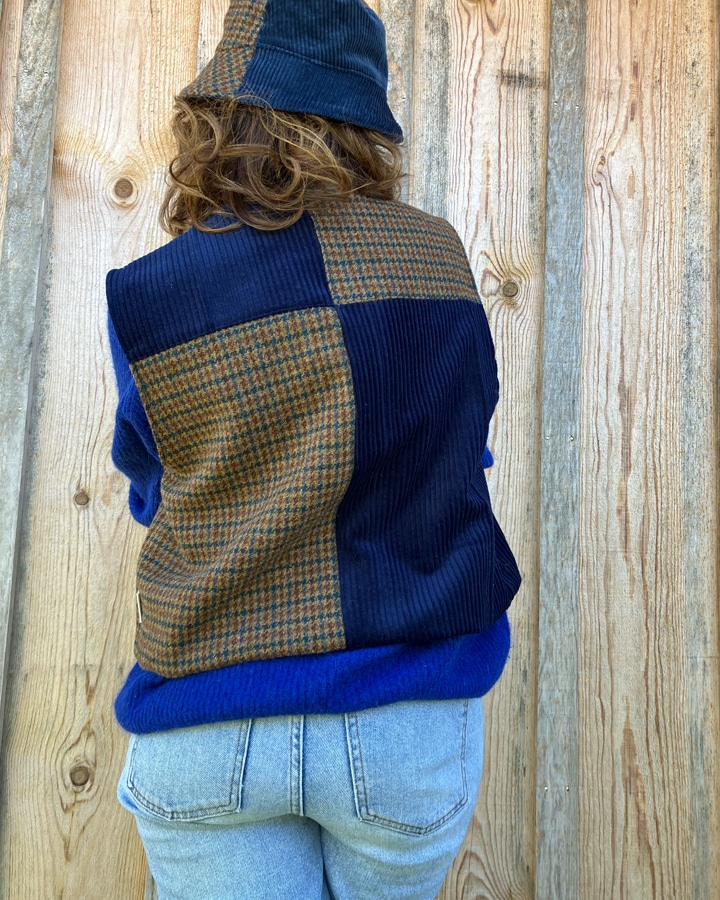 Cette veste est fabriquée à partir d’un ancien pantalon en velours et d’une veste en tweed, ce qui en fait une pièce unique, unisexe et pleine de caractère.